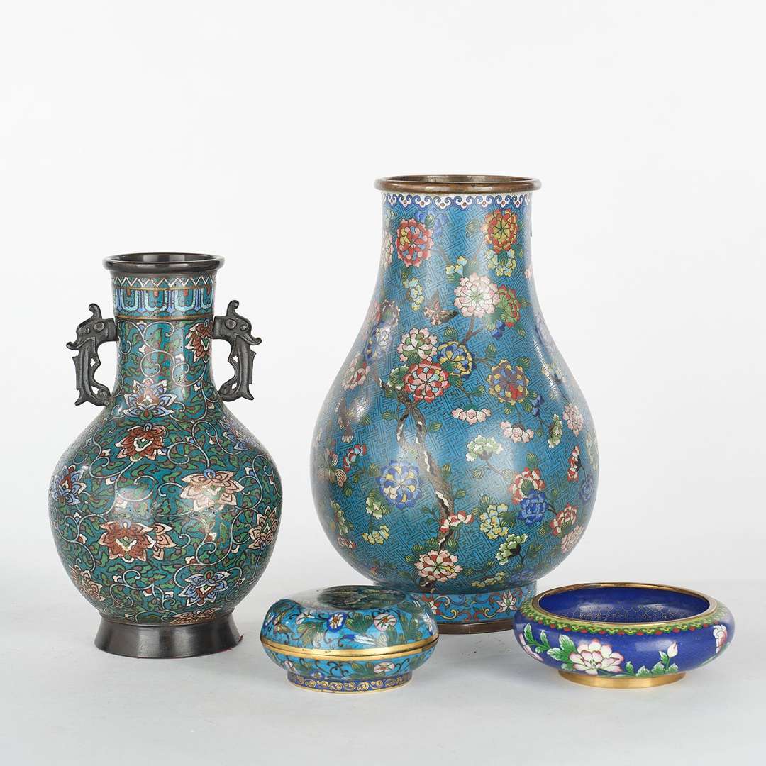 Ensemble comprenant deux vases, une coupe et une boîte en alliage cuivreux et émaux cloisonnés à décor de fleurs et rinceaux.