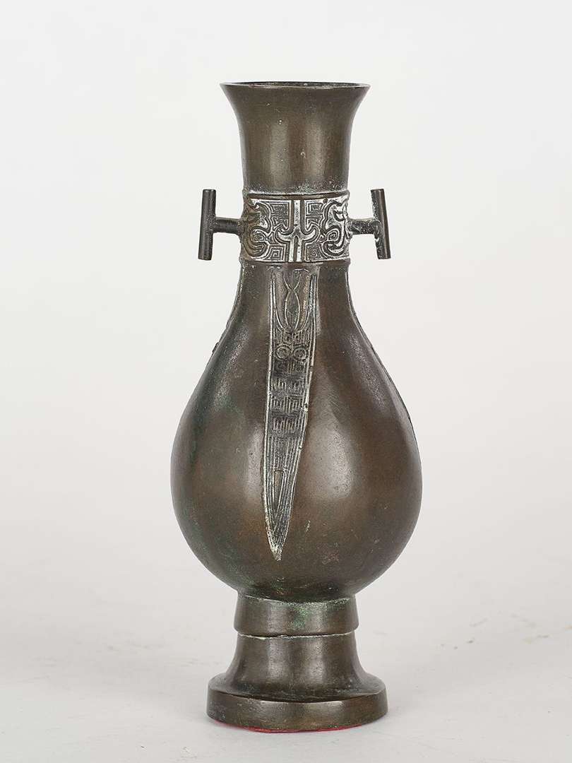 Petit vase bouteille en bronze à patine brune à décor de style archaïsant.