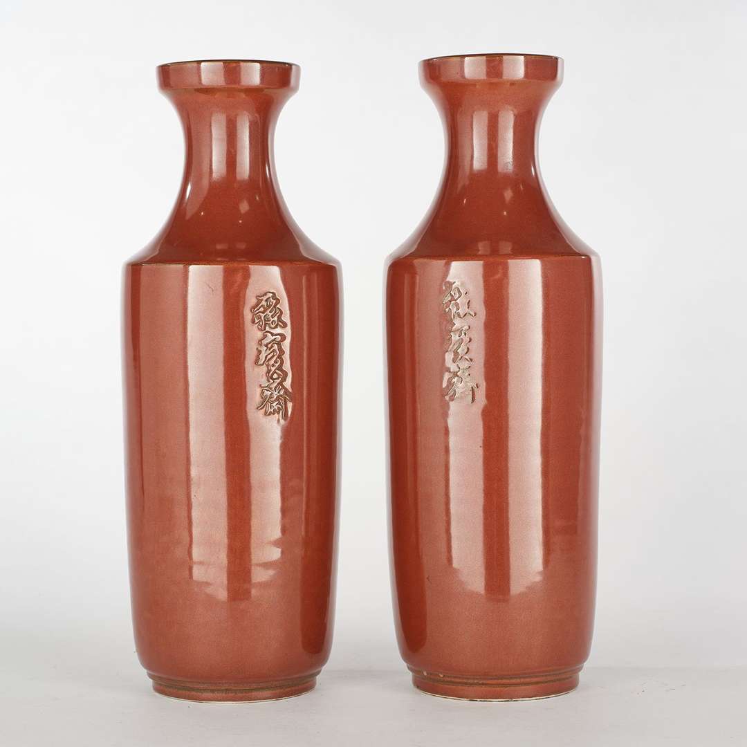Paire de vases rouleaux en porcelaine à couverte monochrome corail sombre. Avec leurs socles en bois naturel.