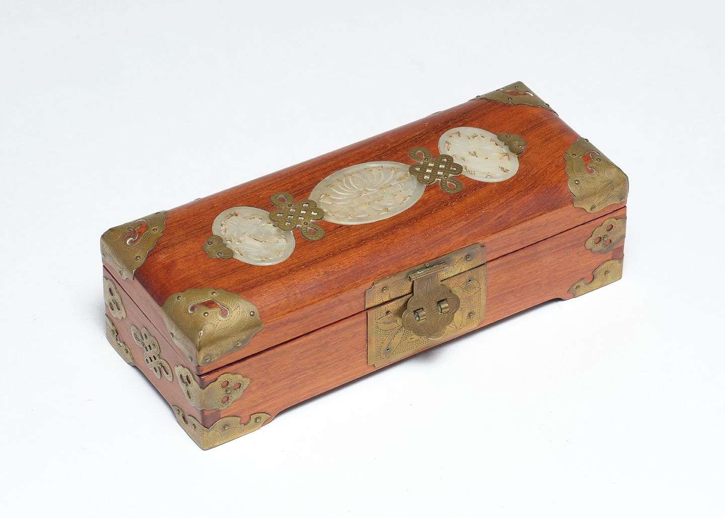 Petit coffret en bois de forme rectangulaire à garniture de laiton. Le couvercle orné de plaques en pierre dure sculptée. Découvre un intérieur à trois compartiments.