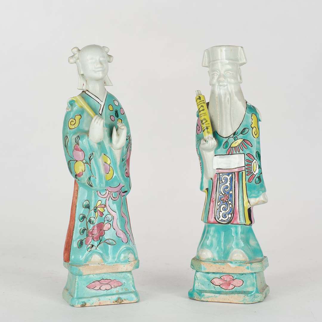 Deux statuettes d'immortels taoïstes en porcelaine aux émaux de la famille rose.