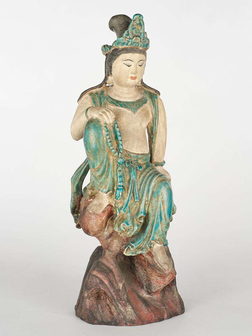 Statue en grès partiellement émaillé turquoise représentant le boddhisattva Guanyin assise en lalitasana sur un rocher.