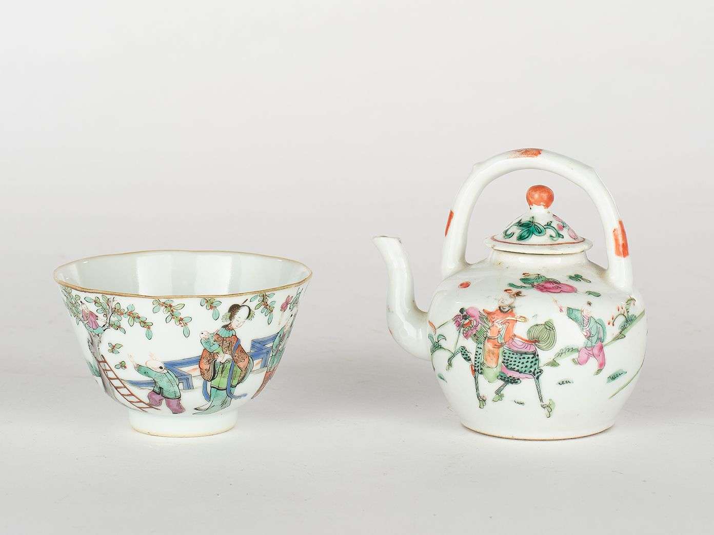 Ensemble en porcelaine aux émaux de la famille rose comprenant une petite théière et un petit bol à décor d'enfants dans un jardin