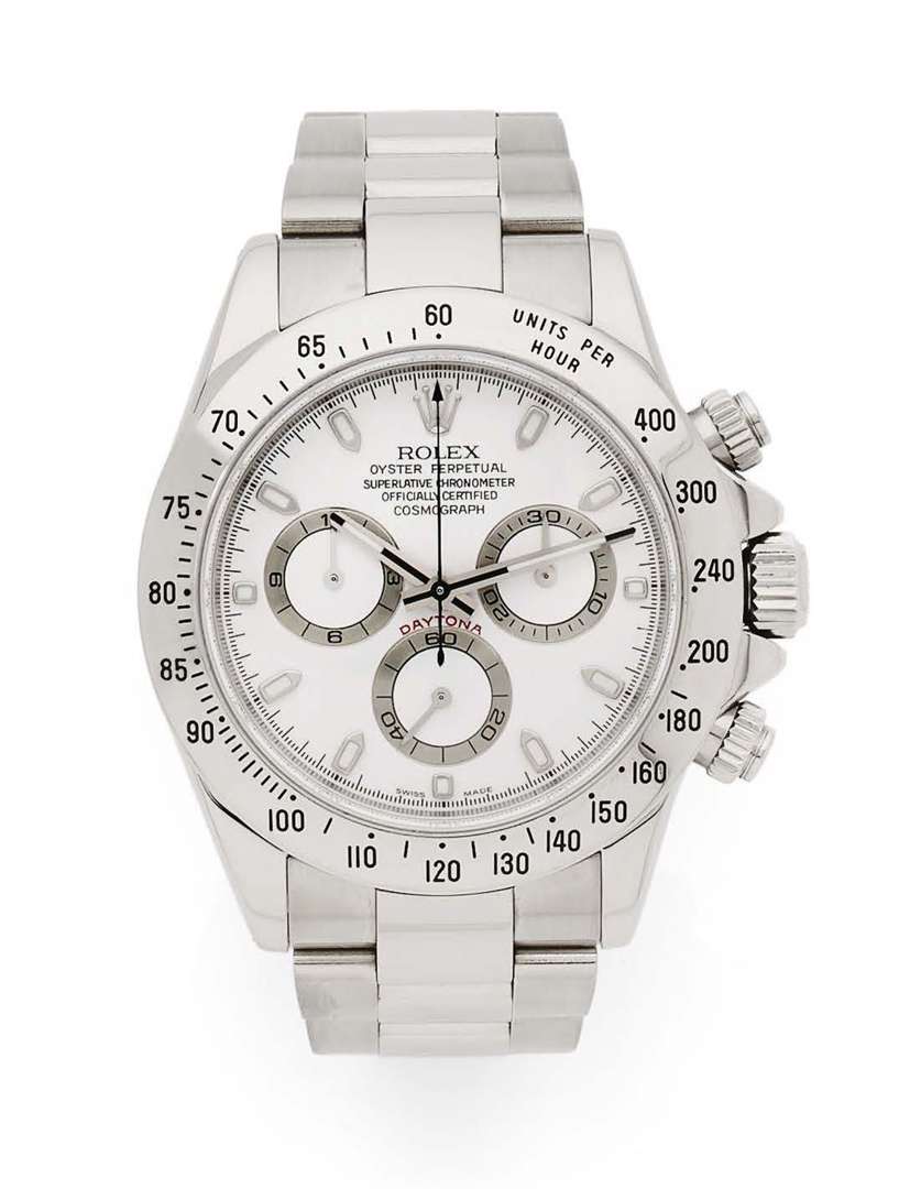 Boîtier : rond, couronne, poussoirs et fond vissés, lunette tachymètre, signé