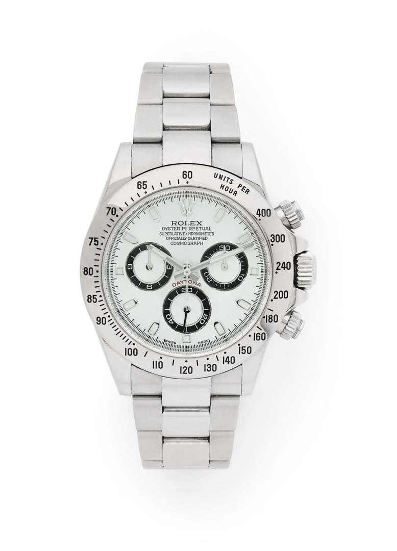 Boîtier : rond, couronne, poussoirs et fond vissés, lunette tachymètre, signé