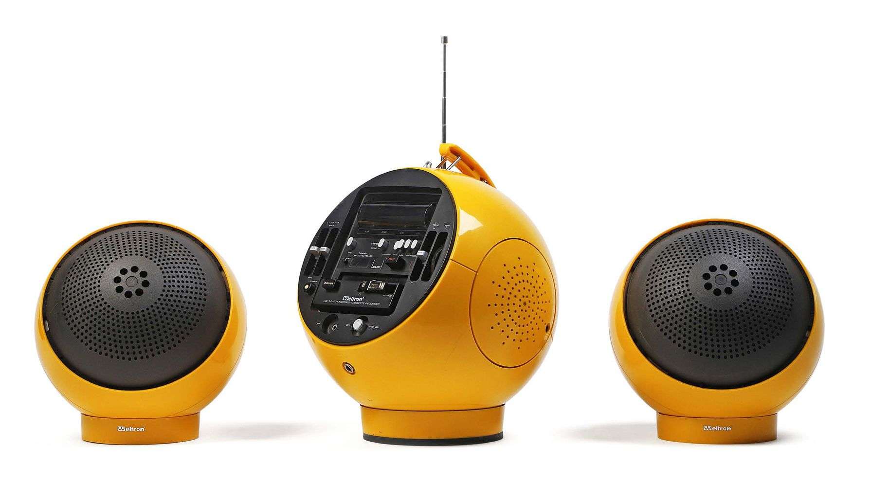 Accompagné de ses deux enceintes acoustiques en ABS jaune