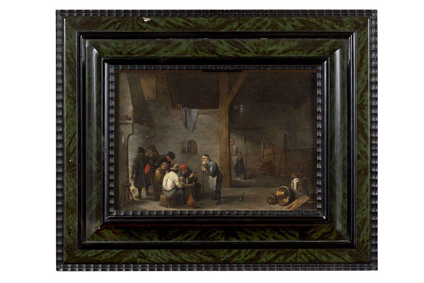 Dans un intérieur aux airs d'étable ou de taverne, des personnages jouent aux cartes autour d'une table pendant que l'hôte prend les commandes en les marquant à la craie sur la table. D'autres discutent devant le feu et une femme, à l'arrière-plan, semble pousser une porte. Notre oeuvre est une réplique d'après le tableau de David Teniers le Jeune, daté d'environ 1643 et conservé dans les collections du Royal Collection Trust (inv. RCIN 405217). Sur l'exposition-événement dans laquelle notre oeuvre aurait été présentée, voir : Ian KENNEDY, "The 'Wrexham Art Treasures' exhibition of 1876", The BRITISH ART Journal, vol. XIX, n°3, pp. 80 et s.