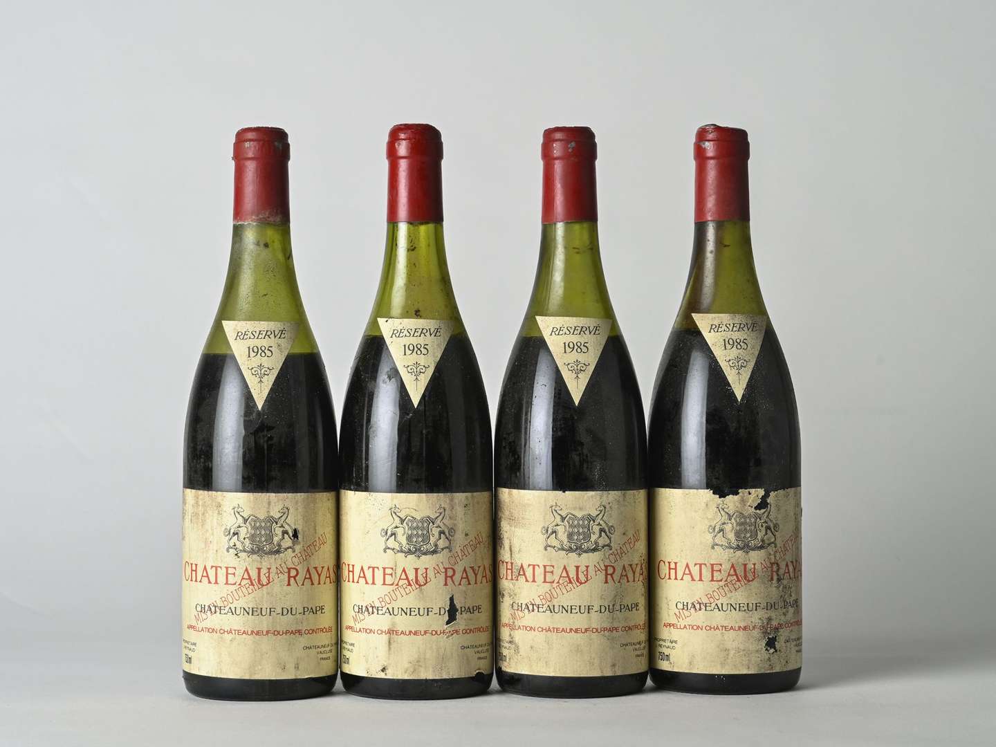 4 B CHÂTEAUNEUF DU PAPE Rouge (1 à 5,5| 2 à 6 et 1 à 7 cm| e.t.h. à e.t.a| clm.s| c.c. légères dont 2 gondolées et 1 légèrement abimée au sommet) - 1985 - Château Rayas