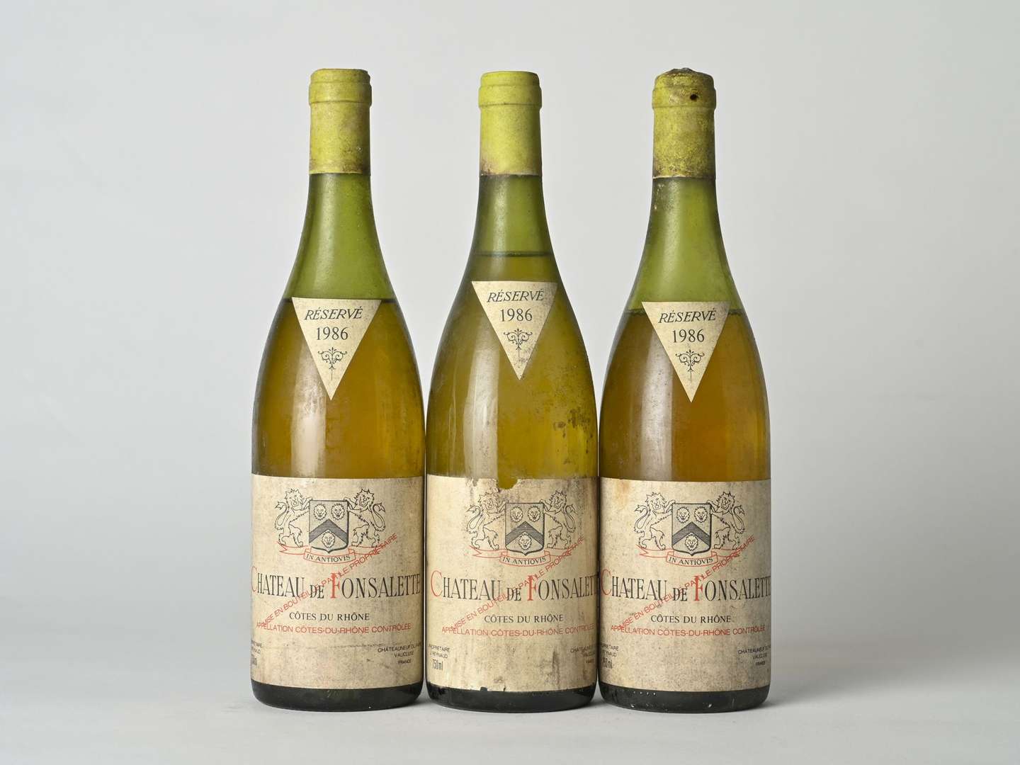 3 B CÔTES DU RHÔNE Blanc (1 à 3,5| 1 à 5,8 et 1 à 6,5 cm| e.t.h. dont 1 e.a| clm.s| c.s.) - 1986 - Château de Fonsalette