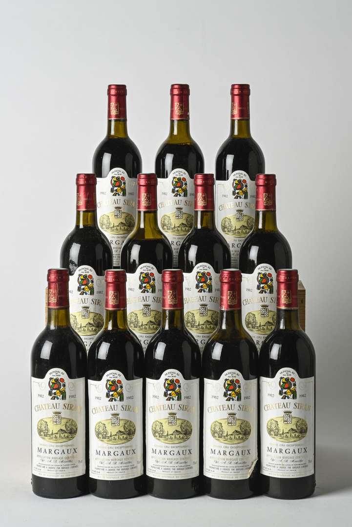 12 B CHÂTEAU SIRAN (Caisse Bois d'origine sale avec pavillon supérieur abimé) (2 B.G| 2 T.L.B.+| 5 T.L.B| 1 H.E. et 2 M.E.+| e.t.h. légères à e.t.h. dont 2 e.a.) - 1982 - Margaux