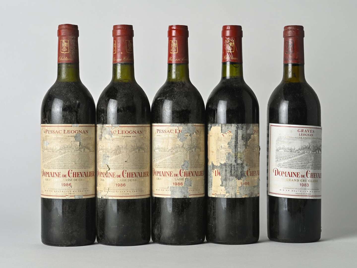4 B DOMAINE DE CHEVALIER Rouge (1 B.G| 3 T.L.B| e.t.a. à e.q.i. fragiles) - 1986 - CC Graves