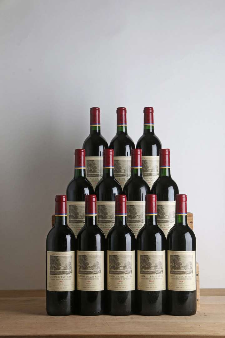 12 B CHÂTEAU DUHART-MILON ROTHSCHILD (Caisse Bois d'origine) (2 B.G| 1 c.l.a. bas de jupe) - 1990 - GCC4 Pauillac