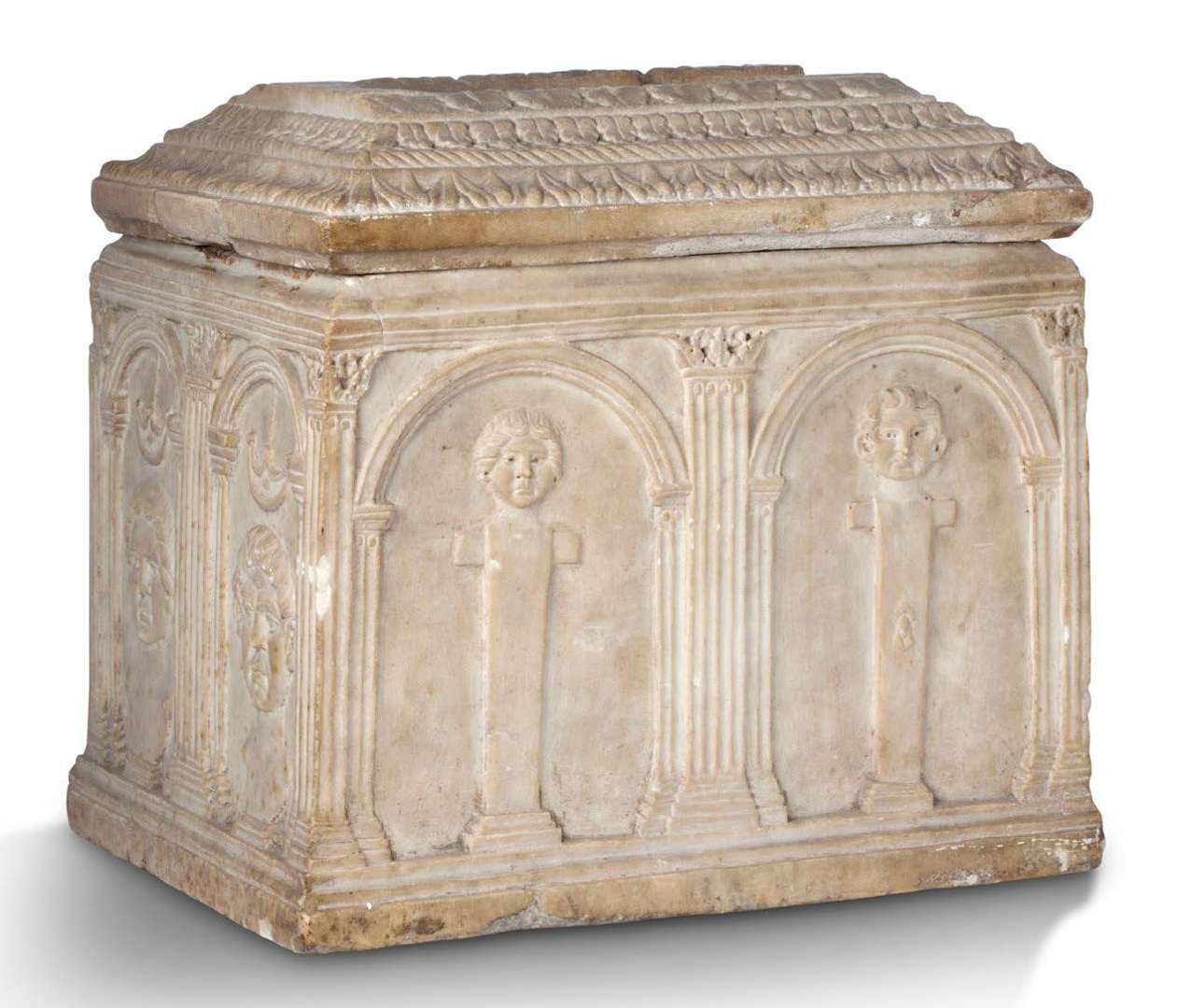 Urne rectangulaire en marbre blanc sculpté en bas relief : sur les deux petits côtés sont les portraits en buste représentant le même couple à deux âges de la vie. Chaque buste est logé dans l'ouverture d'un arc en plein cintre profondément sculpté, reposant sur des pilastres cannelés avec oscillums suspendus. Sur les deux faces principales, les mêmes visages surmontent un corps schématisé curieusement réduit à l'état de gaine plaquée sur une traverse.