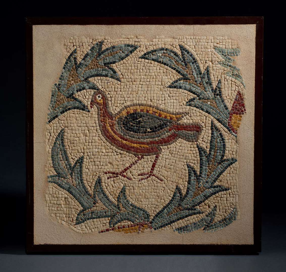 Une caille ou perdrix stylisée est au centre de la composition, sur fond beige dans un entourage de palmes.