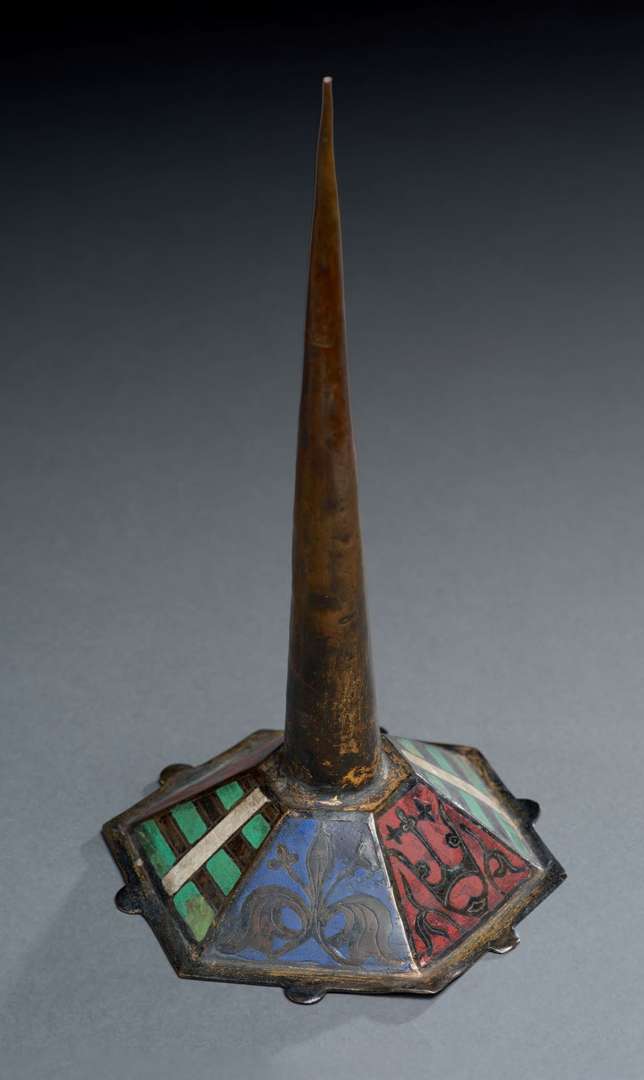 en émail champlevé sur cuivre, la grande pique conique creuse issante du milieu d'une base hexagonale à six pans coupés d'émail champlevé et dorure. À la base de chaque face est une demi-pastille découpée dans le cuivre et dorée. Trois motifs héraldiques émaillés en plein sont répétés chacun deux fois sur la base : De gueules (rouge) à la couronne d'or surmontée en chef de deux fleurons et accompagnée en pointe de deux rinceaux le tout du même / D'or à trois fasces de sinople (vert), au pal d'argent (blanc) brochant sur le tout / D'azur (bleu) à la fleur de lys épanouie d'or.