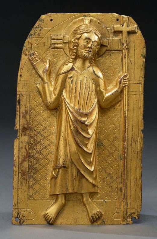traité en relief de cuivre embouti et doré, le Christ se tient debout, pieds et mains visibles, auréolé, il tient de sa main gauche une banière surmontée d'une croix.