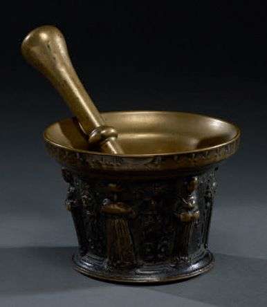 en bronze à décor de six personnages féminins alternants de face et de dos sur fond de semis de fleurs de lys. Masques grotesques, un Christ en Croix et une coquille
