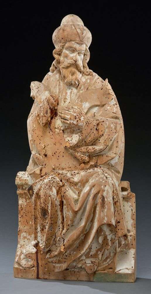 sculpté en bois de tilleul, il se tient assis, revêt la coiffe emblématique des Prophètes de l'Ancien Testament et tient un phylactère.