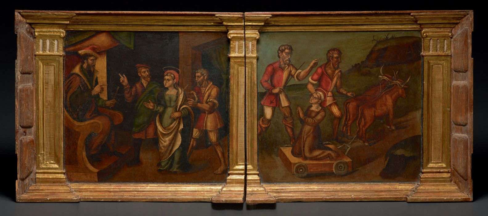 illustrant chacun un épisode de la vie de Sainte Lucie, martyre : la sainte devant le consul Pascasius et la Sainte tirée par un attelage de boeufs.
