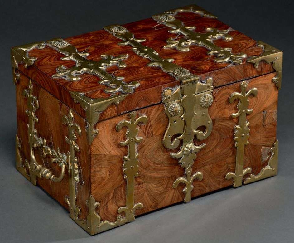 à âme de chêne montée à queue d'arrondes et renforcée, le coffret est entièrement plaqué de bois de rose (y compris au dedans) et est orné de grandes pentures de laiton doré. Poignées latérales en main-tombantes.