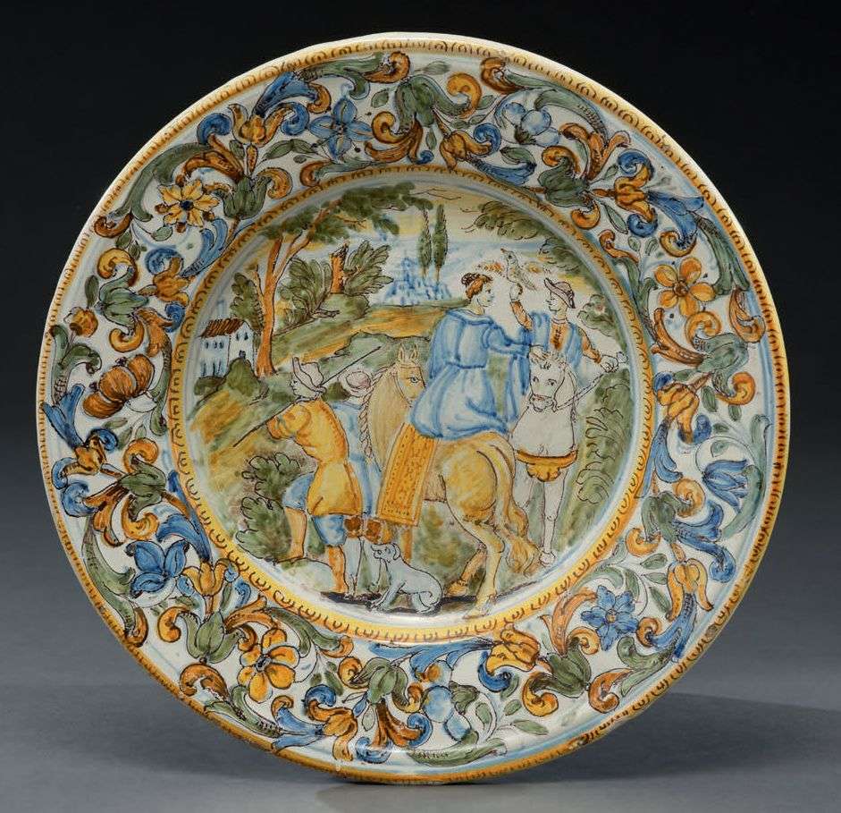 en faïence à décor polychrome au centre d'une scène de chasse au faucon représentant un couple de chasseurs accompagné d'un valet tenant un chassoir accompagné de son chien. Sur l'aile de riches entrelacs de fleurs polychromes.