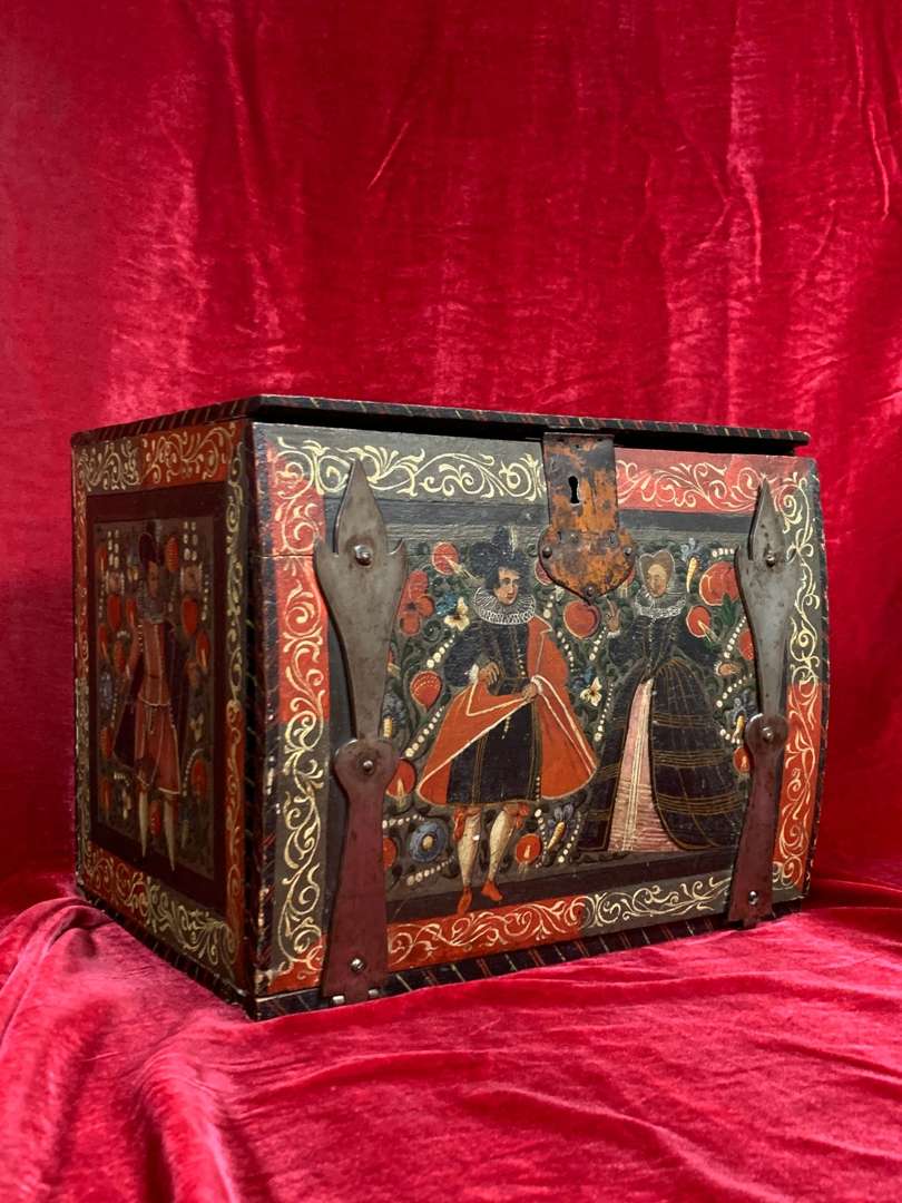 Madame seule et sur le dessus une scène de musiciens jouant sous un dais, tout ceci dans un entourage de symboles amoureux tels : foi héraldique, coeur, pensées et autres emblèmes. L'abattant dévoile sept tiroirs et un tabernacle peint d'une allégorie de la Passion amoureuse sous les traits d'une femme nue. Pentures et serrures de fer forgé.