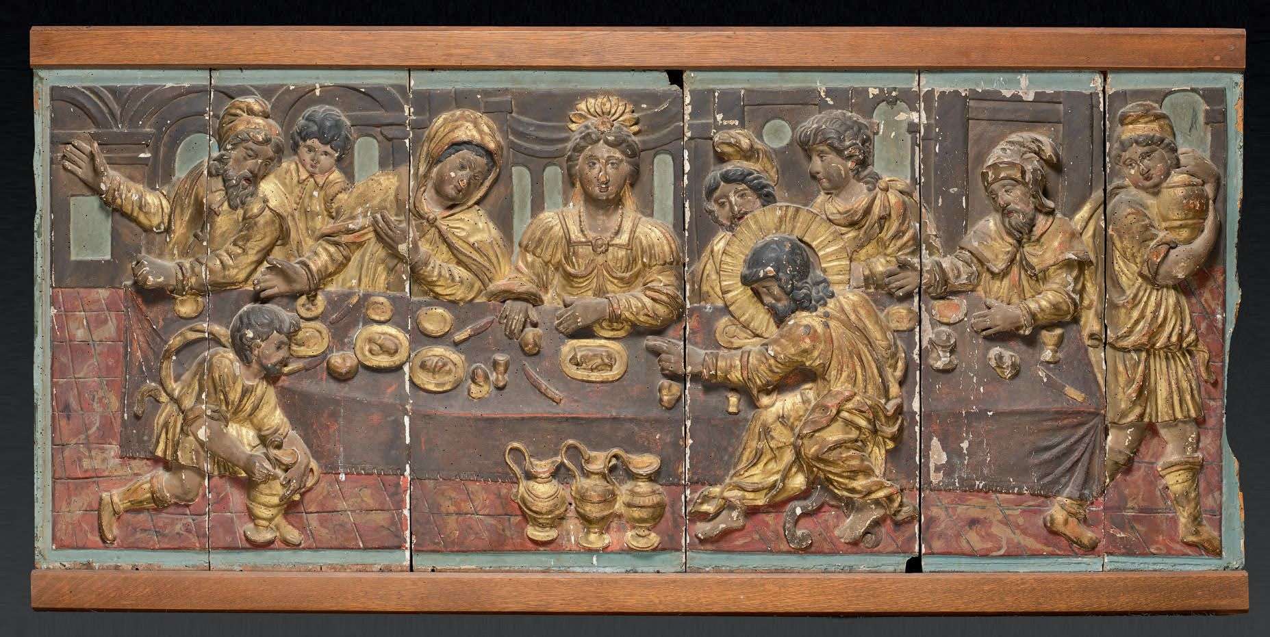 Panneau en relief de bois sculpté, doré et peint polychrome.