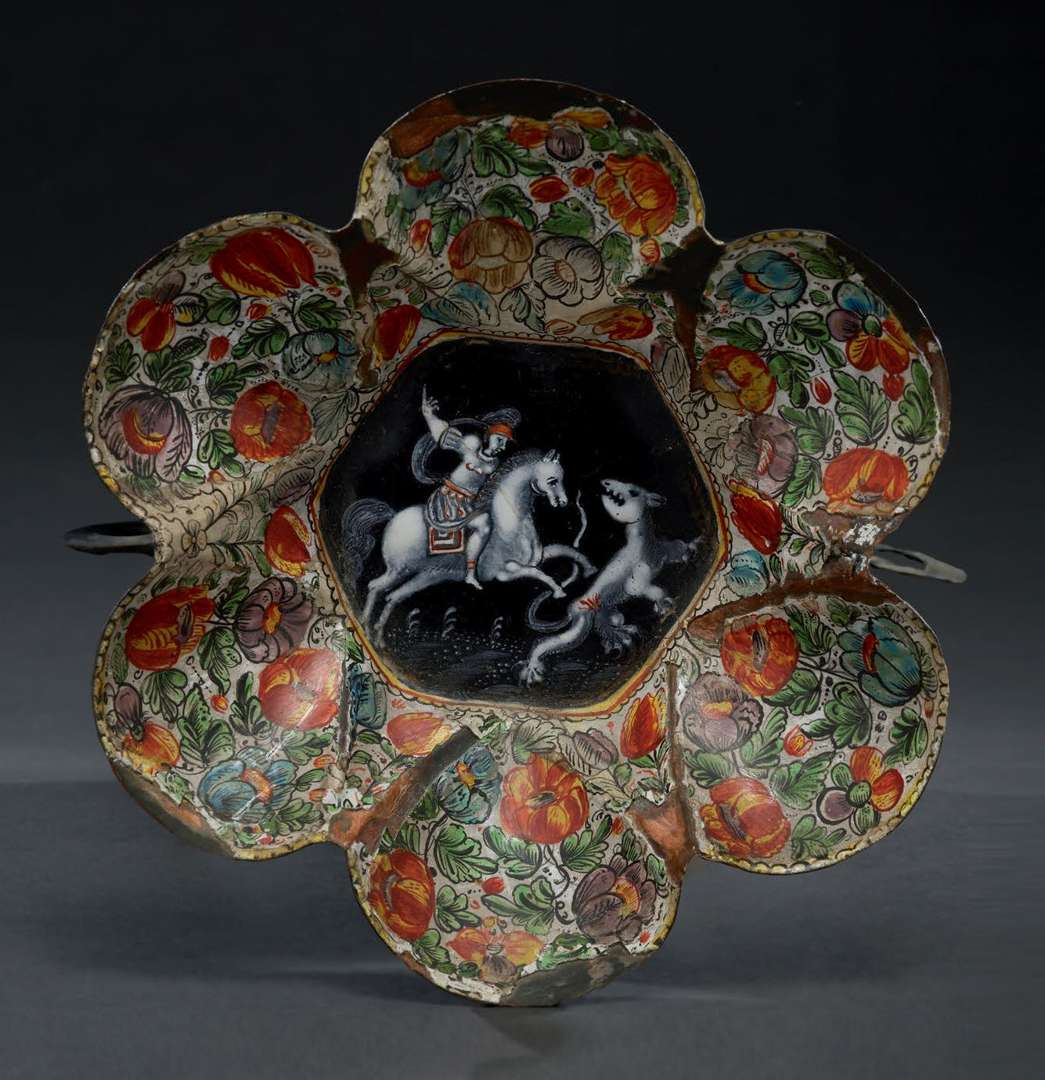 Coupe à six lobes en émail peint polychrome sur cuivre. Au centre Saint Georges terrassant la bête en grisaille ponctuée de rouge sur fond noir et or peint. Sur les côtés : mille fleurs polychromes sur fond blanc. Au dessous une vue d'un château dans un paysage et fleurs stylisées de paillons d'argent sur fond noir et or peint. Deux anses émaillées noir.