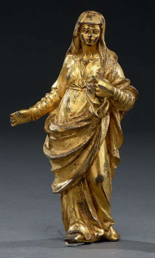 Elle tient de sa main gauche un linge pour essuyer ses larmes. Son voile finement ciselé.