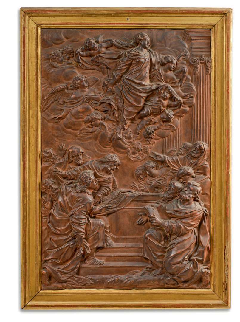 en terre-cuite d'après la composition de Simon Vouet. La Sainte Vierge Marie s'élève au ciel après sa mort, son corps étant emporté par les anges. En dessous, les apôtres effrayés découvrent sa tombe ouverte et vide, à l'arrière plan une façade de temple soutenue par des colonnes ioniques cannelées.