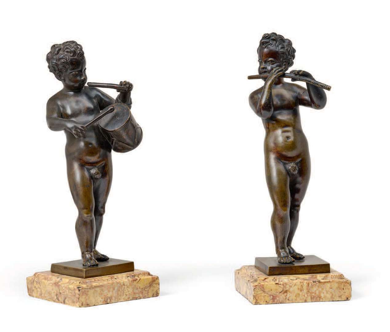 en bronze à patine brun nuancé, représentant respectivement un joueur de flûte traversière et un joueur de tambour à la baguette et à la flûte à bec.