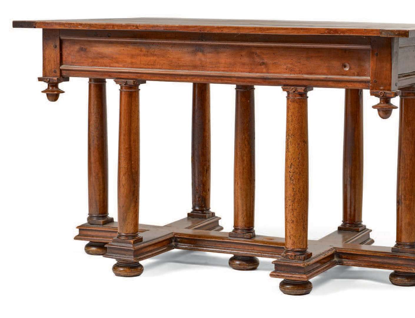 Elle ouvre à deux tiroirs latéraux permettant d'acceuillir deux rallonges et repose sur un piétement composé de sept colonnes légèrement renflées reliées entre elles par une entretoise en forme de croix de Lorraine et terminés par des pieds boules.