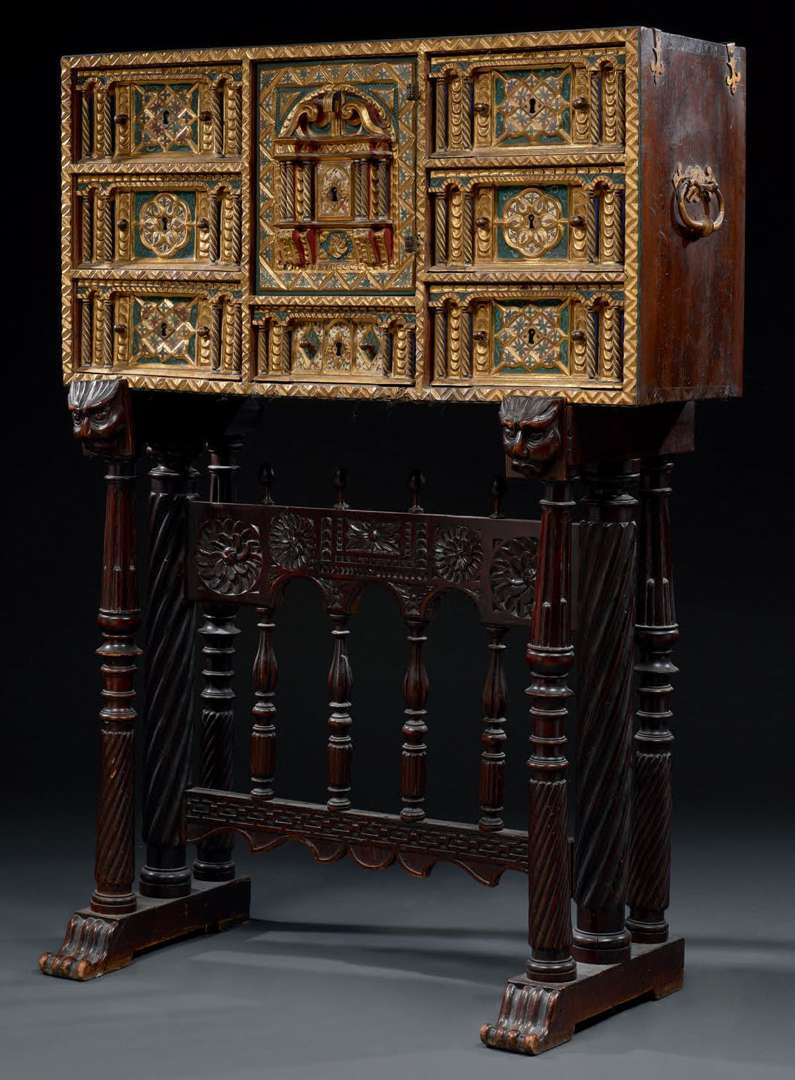 la caisse en bois de noyer offrant sept tiroirs et un vantail en tabernacle donnant sur trois tiroirs. La façade richement ornée de colonettes torses, dorée, polychromée et incrustée de plaquetttes d'os peint.
