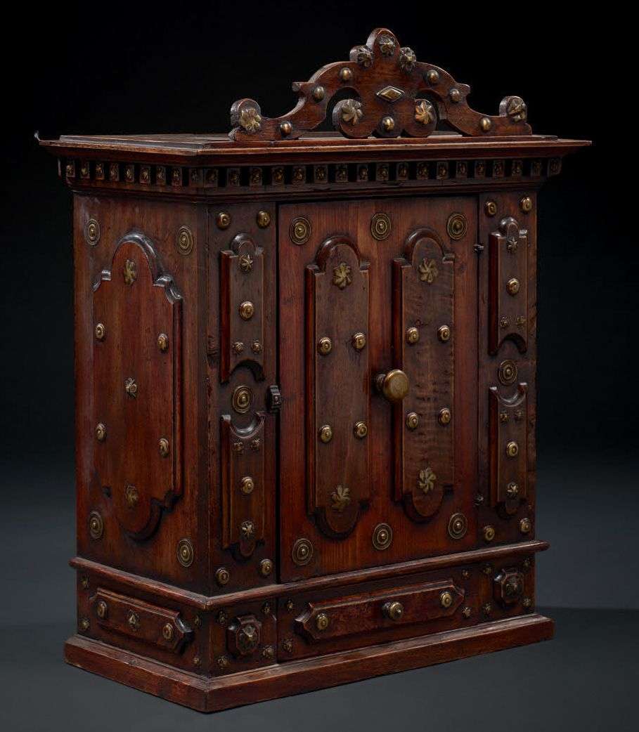 en noyer ouvrant à un vantail et un tiroir dans le soubassement à décor de ressortis moulurés, rosaces et clous en laiton.