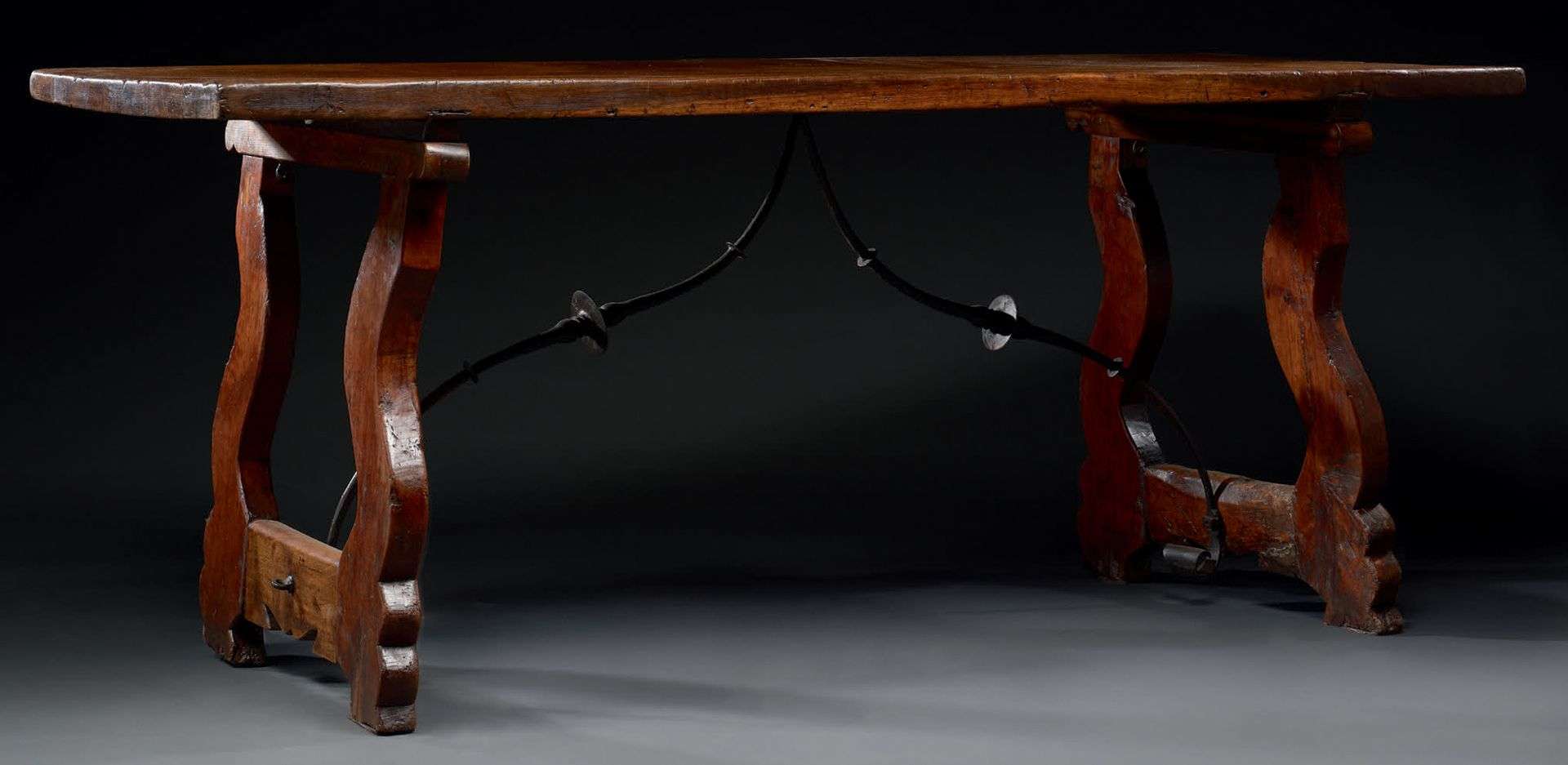 en noyer blond, le piètement à quatre pieds à traverses en forme de lyre | entretoises sinueuses en fer forgé reliant les pieds au plateau. Plateau d'une pièce.