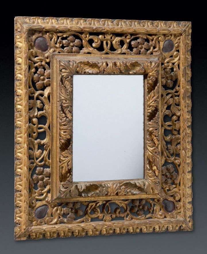 en bois sculpté et doré à décor ajouré de fleurs et enroulement. Anneau de suspension originel en fer forgé.