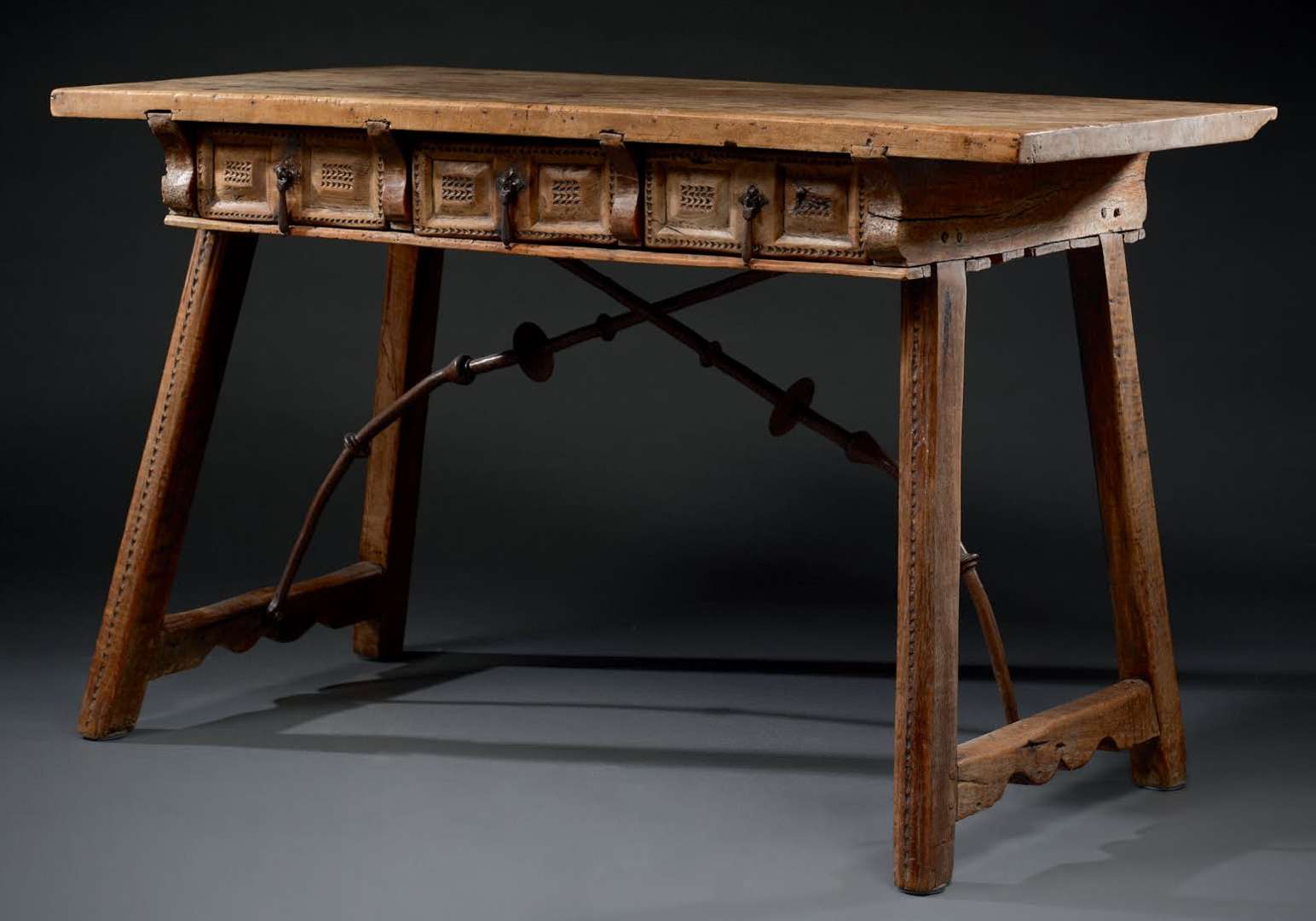 en bois de noyer blond, le piètement à quatre pieds disposés en trapèze tel des trétaux | entretoises sinueuses en fer forgé reliant les pieds au plateau. Ceinture ouvrant à trois tiroirs au décor sculpté à la gouje. Beau plateau d'un seul tenant.