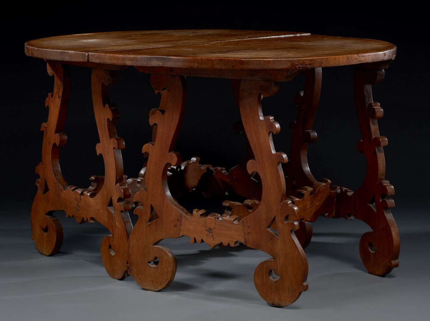 en bois de noyer composée de deux bouts de table formant consoles amovibles en demi-lune reposant sur des piètements en lambrequins en forme de lyre et entretoise.