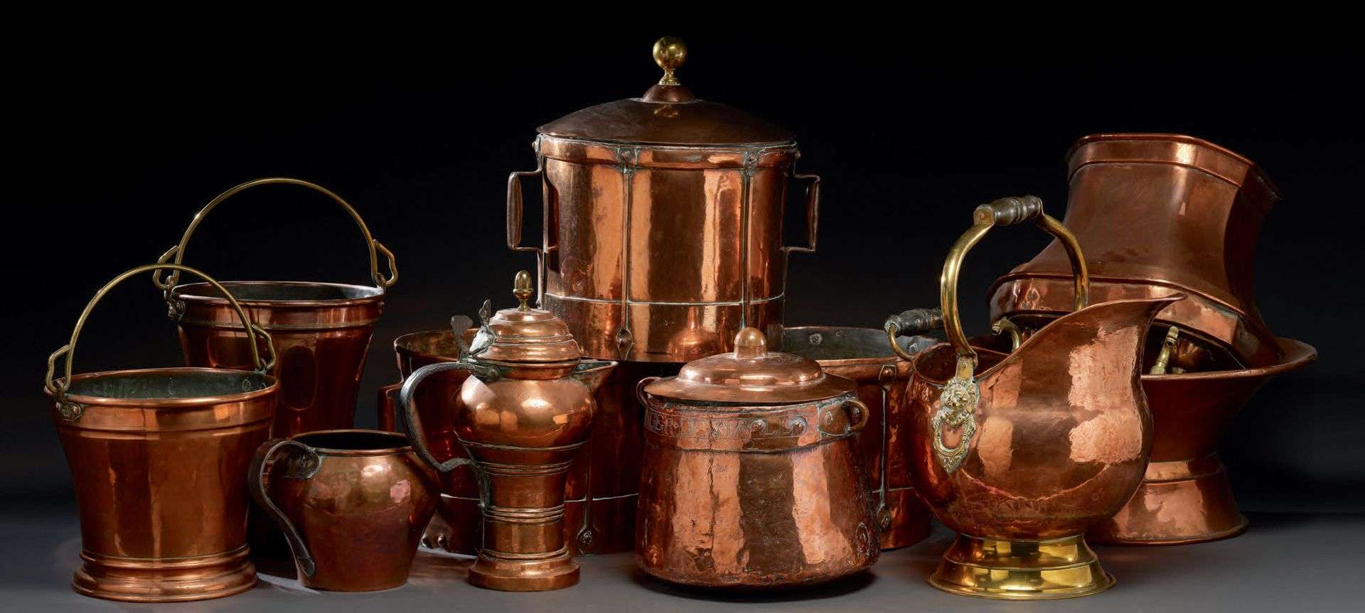 composé de trois ferrats (dont un couvert), un sceau à charbon à mufles de lion, une fontaine à eau, deux verseuses et un rare bassin à anse couvert nominatif gravé sur le pourtour «PIERRE BERNARD BOVLANGER DESPALLI 1782».