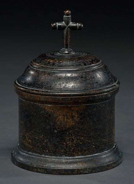 circulaire, vide, en alliage métallique cuivreux, le couvercle amovible en forme de dôme surmonté d'une croix.