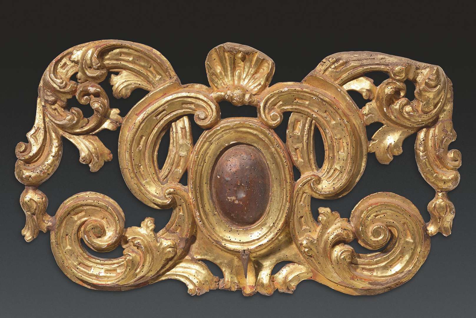 en bois sculpté et doré à décor de volutes ajourées. Au centre un ovale simulant un reflécteur à fond teinté. Piques pour bougie en fer forgé.