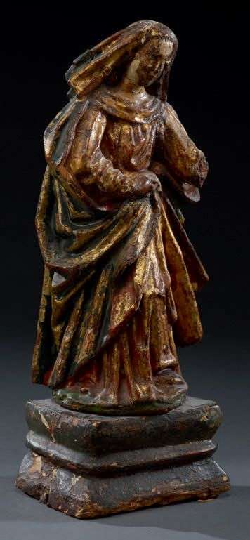 debout telle présentant l'Enfant Jésus, en bois sculpté, doré, les yeux en verre incrusté.