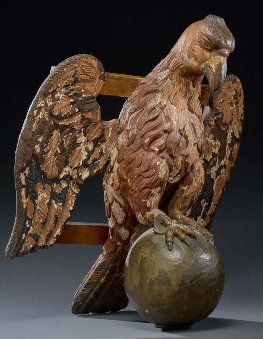 en bois sculpté et peint polychrome, il se tient debout sur un globe. Accueillage en fer forgé au dessous.