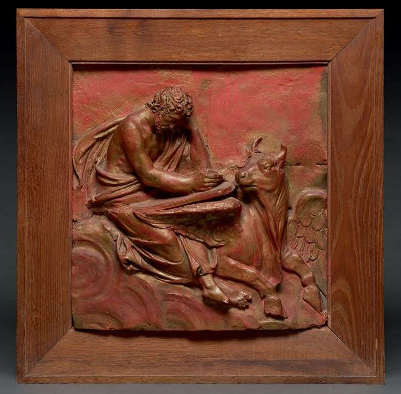 terre cuite en bas relief sculpté représentant le Saint concentré à l'Écriture Sainte de son Évangile appuyée sur le taureau ailé emblématique parmi les nuées.