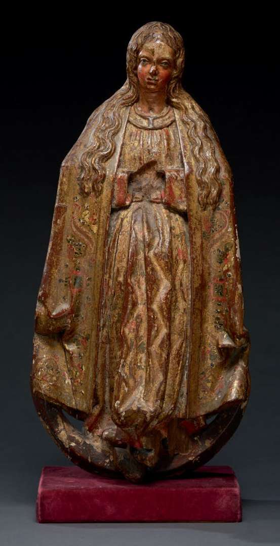 en bois sculpté en ronde-bosse, polychromé et doré. Rare dans l'iconographie : elle est représentée enceinte. Les cheveux découverts, les mains jointes, elle se tient debout, sur un croissant de lune écrasant de ses pieds le serpent.