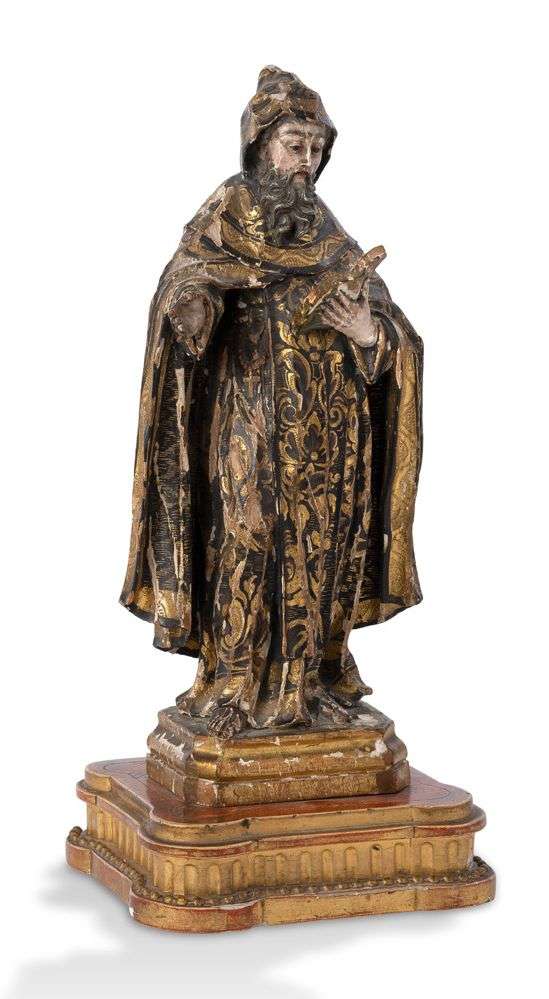 en bois sculpté en ronde-bosse polychromé et doré, yeux en verre. Il se tient debout, la tête coiffée d'une capuche, il tient de sa main gauche les Saintes Écritures et son bras droit avancé tenait probablement ses chaînes emblématiques (manquantes).