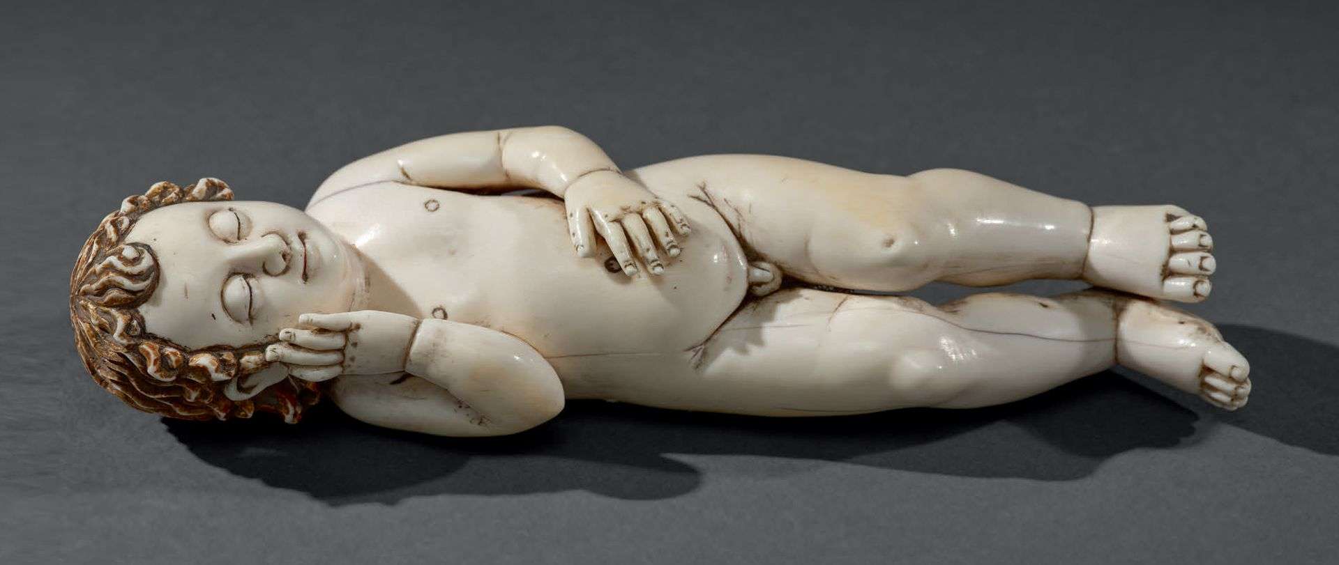~ en ivoire sculpté représentant l'Enfant Jésus allongé, les yeux mi-clos avec sa main droite près de son visage, ses cheveux finement sculptés sont dorés.