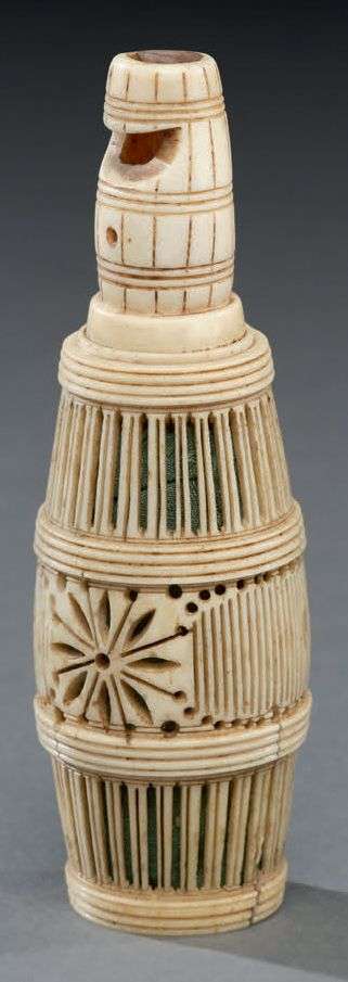 ~ en ivoire finement sculpté, la partie basse fuselée formant étui, la partie haute est le bouchon ouvrant sur l'étui en forme de tonneau.