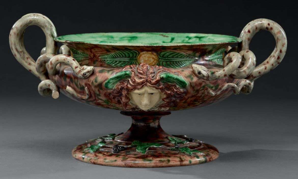 sur pied, en barbotine | aux têtes de méduses, prises en serpent, dans le goût de Bernard Palissy.