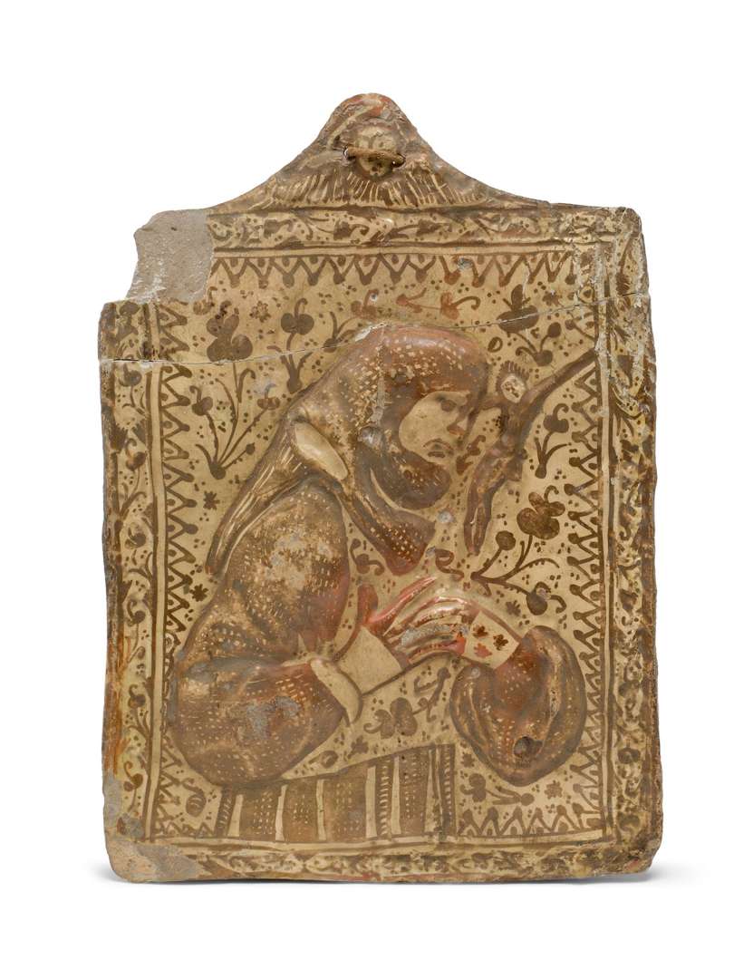 en faïence à reflets métalliques, lustre brun cuivré sur fond crème représentant